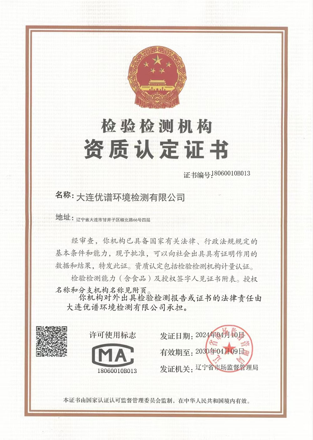 大連優(yōu)譜環(huán)境檢測有限公司是中國領(lǐng)先的第三方權(quán)威檢測機構(gòu)已取得CMA中國計量認(rèn)證資質(zhì)認(rèn)定,遼寧省生態(tài)環(huán)境廳備案,具備向社會出具公正數(shù)據(jù)的資格。擁有國際先進(jìn)的檢測分析儀器和經(jīng)驗豐富的檢測化驗工程師團隊。